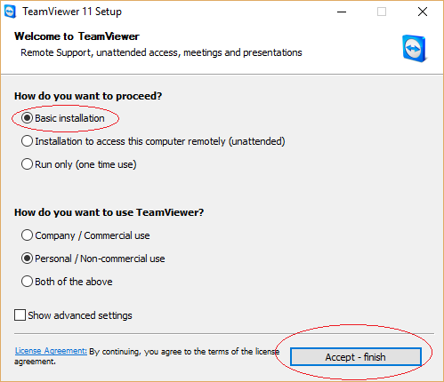 Bước 2 : Mở thư mục chứa file vừa tải về (tên là TeamViewer_Setup_vi) và click đúp chuột vào file đó để cài đặt. Bạn sẽ thấy một cửa sổ hiện ra cho phép bạn chọn cài đặt, Bạn check chọn vào Basic installation và Personal / non-comercial use rồi click vào Accept - finish như hình dưới.
