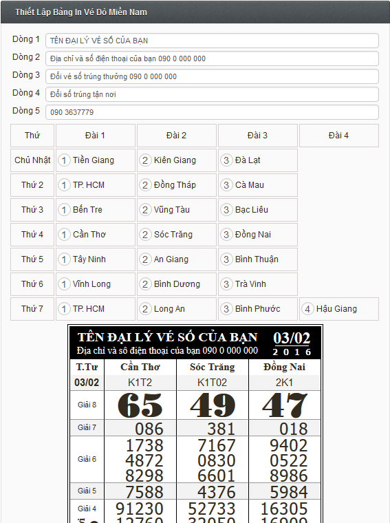 - Để thay đổi thông tin trên bản in vé dò bạn vào mục Thiết lập bản in cập nhật, thay đổi tên Đại Lý, số điện thoại, địa chỉ... Bạn có thể kéo để định lại vị trí các đài chính phụ hoặc bỏ bớt các đài để phù hợp với khu vực của bạn... >> Xem lại bản in và Lưu thiết lập.