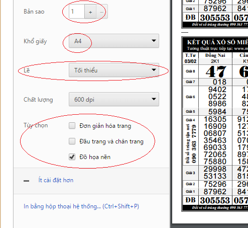 1/ Mở mục Cài đặt khác > Chọn Khổ giấy A4 >> Chọn canh lề Tối thiểu (có thể chọn tùy chỉnh để thay đổi khoảng cách lề tối ưu cho từng loại máy in) >> Bỏ chọn mục Đầu trang và chân trang >> Chọn Đồ họa nền >> Xem lại trang in có cân đối chưa bấm in thử. [Khi in thực tế chọn số Bản sao - số tờ cần in 1 lần]